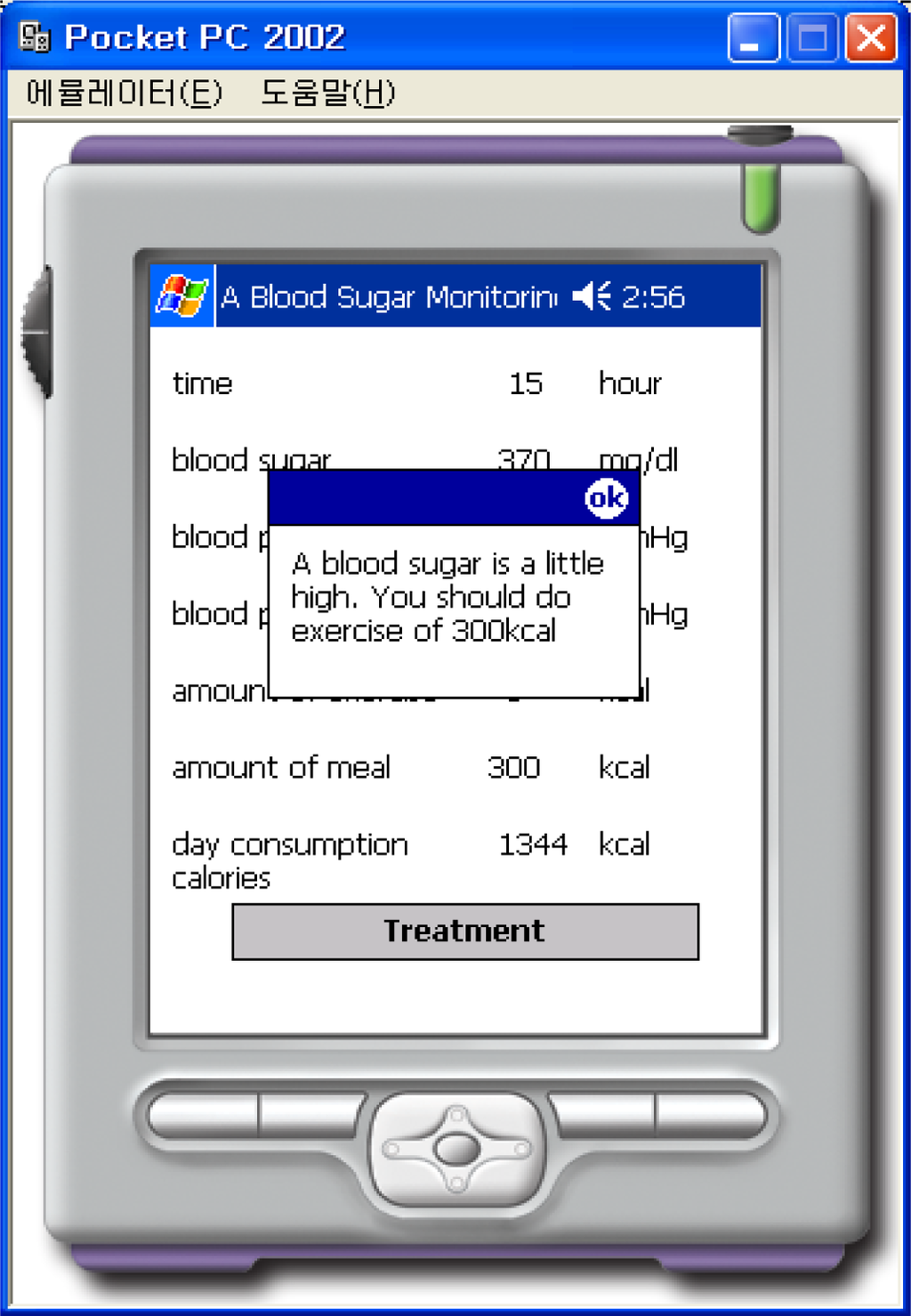 If the patient clicks on the prescription button, the system connects to the “BloodSugarService” Web service that uses the normalized data as input to the KNN classifier for K = 3. The calculation is performed with the sample data on the server computer using the information such as the time, blood sugar, systolic blood pressure, diastolic blood pressure, amount of exercise, amount of meal, calories, etc. The PDA is informed of the results in the form of a prescription, as shown in Figure 13 based on the calculated results. According to the prescription, the patient should eat more, do more exercise, take insulin, take a rest, or continue as normal.