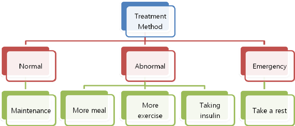 There are 5 types of treatment methods considered in the proposed system, as shown in Figure 2. First, the patient’s current condition is categorized as normal, abnormal or emergency. Patients in a normal state simply maintain that state. When the patient’s state is abnormal, they can eat more, exercise more, or take insulin. In an emergency situation, the patient should rest.
