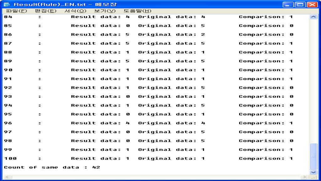 The test data is processed and the resulting values comprise the treatment recommendations of the blood sugar monitoring system based on rules. Samples of the experimental rule-based results are shown in Figure 3. The resulting values are the treatment method that is selected from rule-based inferences and the numerical value is the treatment method identified from the test data. If two values are the same, then set is 1. Otherwise it is set to 0. The match of 42 among 100 total test data is shown in Figure 4.
