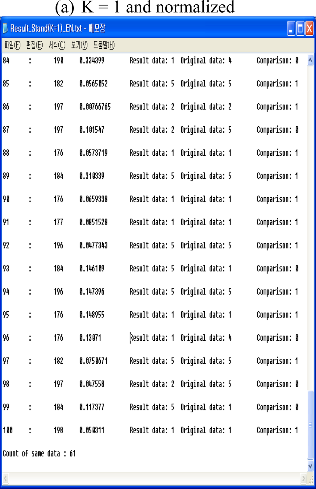 If the selected treatment value is the same as the original test value, the result is 1. Otherwise it is 0. The results when K = 1 are that 61 out of 100 are the same, 65 are same when K=3, and 61 are the same when K = 5, as shown in Figure 6.