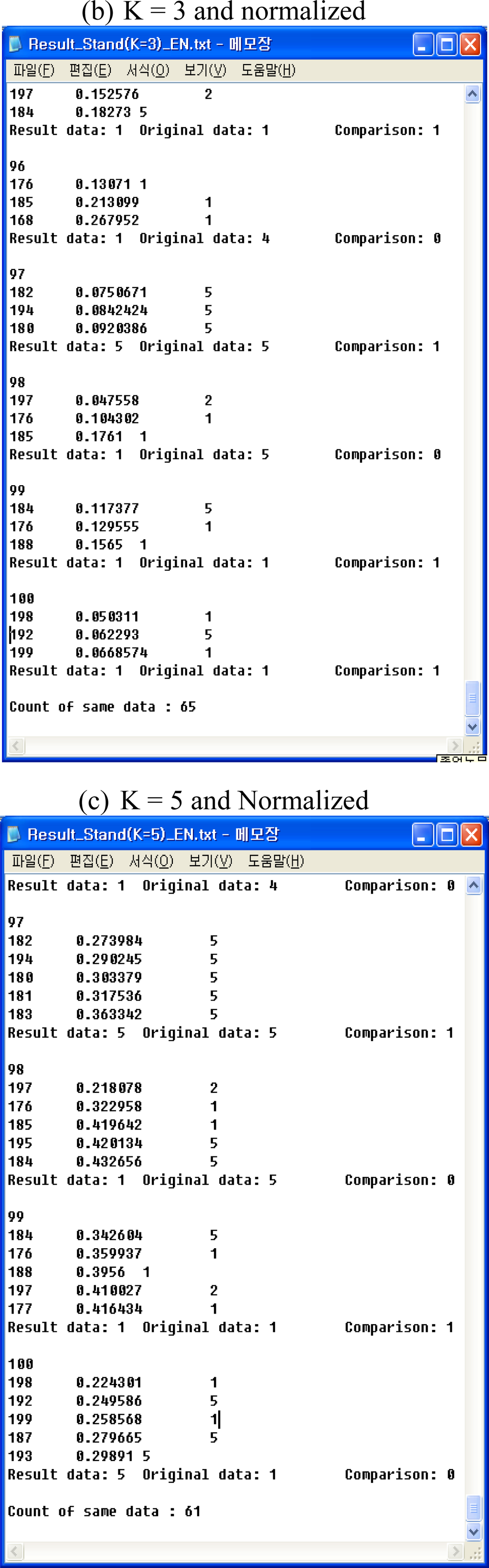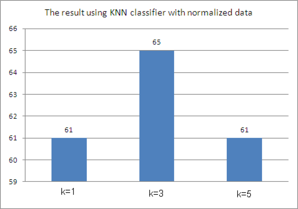 When K = 1, the algorithm selects the sample data set having the lowest calculated value in that data set. If K = 3, it selects three sample data sets with the lowest calculated value out of one test data set. It selects the most appropriate treatment method among the three methods of treatment according to the appropriate principle of majority rules. When K = 5, it selects five of the sample data having the lowest calculated value from one set of test data. It selects the most appropriate treatment method among the five methods of treatment according to the appropriate principle of majority rules. This paper compares the cases where K = 1, K = 3, and K = 5. Also, if the gap between each set of data becomes large, the calculated value of the KNN classifier becomes large and does not produce good results. Therefore, it reduces the gap between each data set through normalization and compares it with cases where the data is not normalized.