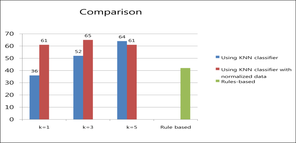Both the blood sugar monitoring agent systems using the KNN classifier and the KNN classifier with the normalized data obtained the best results when K = 3. Also, the blood sugar monitoring agent system based on rules obtained similar results to the blood sugar monitoring agent system using the KNN classifier. However, the rule based method based requires human expert input, because formulating the rules requires previous knowledge about diabetes. The blood sugar monitoring agent system using the KNN classifier with the data normalized between 0 and 1 obtained the best results among the three methods. Therefore, the blood sugar monitoring agent system using the KNN classifier with normalized data, to reduce the gaps between the data, identifies the most appropriate treatment method. Also, the KNN algorithm is able to classify data easily using test data without prior learning. Thus, it can select the method of treatment without the help of a human expert possessing medical knowledge of diabetes. Figure 7 shows a comparison of the results.