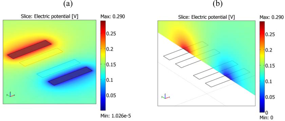 Distribution of electric potential in the 4-electrode array for a current of 10 μA through the external electrodes and a 1 mS/cm solution at the surface (a) and at a cross-section (b).