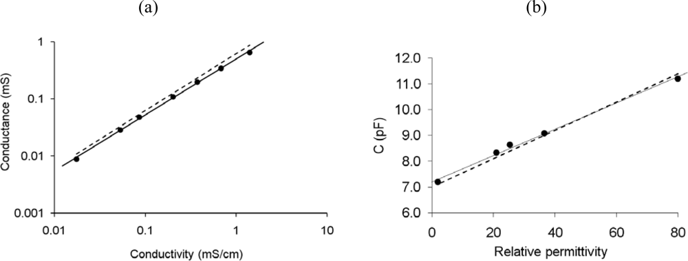 The interdigitated electrodes exhibit a linear response to conductivity and permittivity as shown in Figures 5a and 5b, respectively. The response is obtained from the corresponding components of the equivalent circuit fitted to the impedance spectra as described elsewhere [11]. The linear response to permittivity does not cross the origin due to the parasitic capacitance of the electrodes with the silicon substrate. The cell constant from conductivity measurements is 1.72 cm−1 and from permittivity measurements is 1.76 cm−1, in good agreement with the values calculated from simulations (1.61 cm−1).