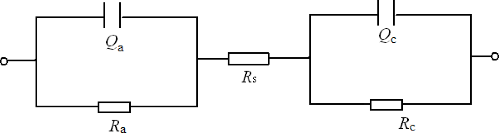 The elements Ca and Cc (interfacial capacitance of the steel anode and the Ti/MMO cathode) are replaced by the constant phase elements Qa and Qc. Ra (in Ω) and Rc represent the polarization resistances of the steel anode and cathode, respectively. Rs represents the cement mortar resistance between the steel anode and cathode. The symbol Q usually denotes a CPE element, and the impedance of Q can be given as follows: