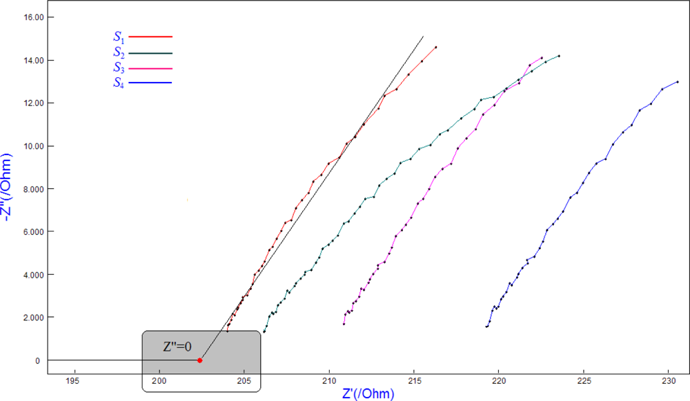 where a represents the slope, and b represents the intercept of the impedance curve. The values a and b can be calculated from the data shown in Figure 3. Then, Rs (the red point in the shaded area, corresponding to Z″ = 0) can be obtained.