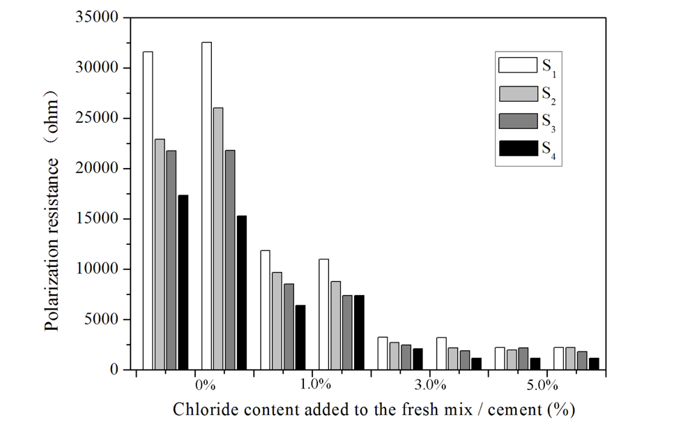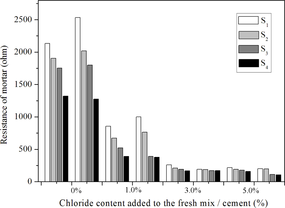 To account for the CPE-like characteristics of the interface between the cement mortar and steel anodes, a range of frequencies from 1 kHz to 50 kHz was used to obtain more precise Rs values. When the measured Rs values for the mortar cover with or without added chloride are compared, the Rs value of the chloride-containing mortar is found to always be much lower. The addition of chloride increases the electrolytic conductivity of the mortar and may cause a potential increase in the corrosion risk. The mortar resistance depends significantly on the chloride content of the mortar, but this effect does not seem to be significant when the chloride content is greater than 3%.