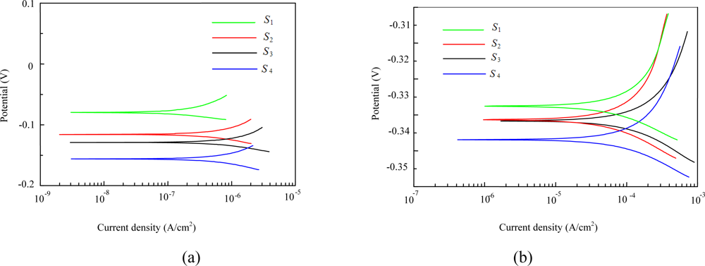 Polarization curves (E-log i) of the built-in steel anodes (S1–S4) of the sensor embedded (a) in cement mortar A; (b) in chloride-contaminated mortar (sample C).