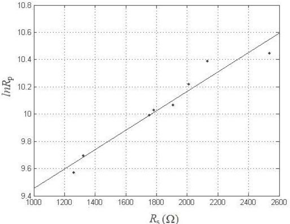Figure 7 presents a plot of ln Rp versus Rs in the mortar without added chloride, in order to demonstrate the relationship between these two parameters. A nearly linear relationship between ln Rp and Rs was observed. The straight line in Figure 7 is described by the following equation: