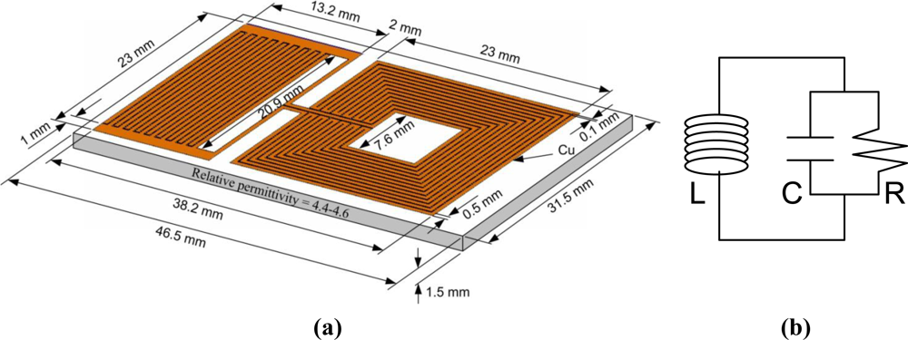 Passive, wireless sensor which consists of inductor and interdigital capacitor (IDC) is used as a sensor for a large number of measurements. Estimation of certain parameters of the environment such as the humidity, the concentration of some gases, etc. can be easily calculated from changes in the capacitance of the IDC. The usual LC sensor design is constructed from the spiral inductor placed around an interdigital capacitor [13–15]. The major drawback of this solution is that if the inductive structure is realized as a square spiral inductor it is necessary to have one underpass or overpass conductor for connecting the inner terminal to the outer contact. This requires the soldering one extra wire or adding another layer of a conductor [16] and consequently complicates the fabrication process and increases the production costs of the sensor. Furthermore, if this overpass is implemented with a discrete wire, smooth and good contact between the sensor and the building material is difficult (or almost impossible) and it can be a problem during measurement.