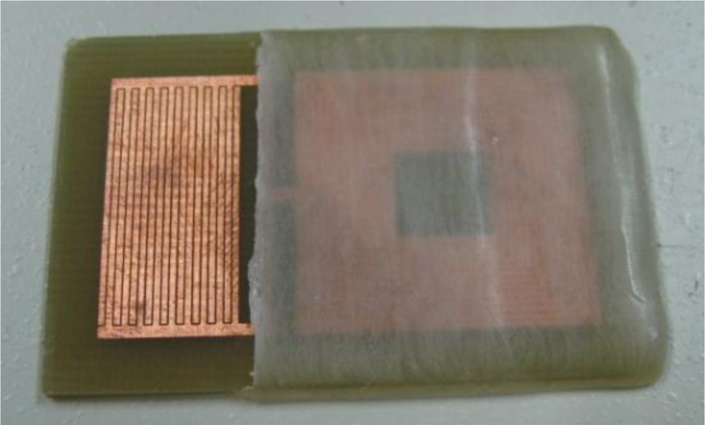 The sensor was made on a single-sided printed circuit board (PCB) with copper as a conductive material. When the capacitive part of the sensor absorbs water, its effective dielectric constant increases due to the high dielectric constant of water (about 70–80). The variation in the effective dielectric constant changes the capacitance of the IDC, resulting in the shift of the sensor’s resonant frequency and allowing tracking of water content or humidity levels. The top view of the fabricated sensor is shown in Figure 2. A thin layer of paraffin wax can be also seen, covering the inductive part of the sensor, preventing the short circuit between the inductor’s turns.