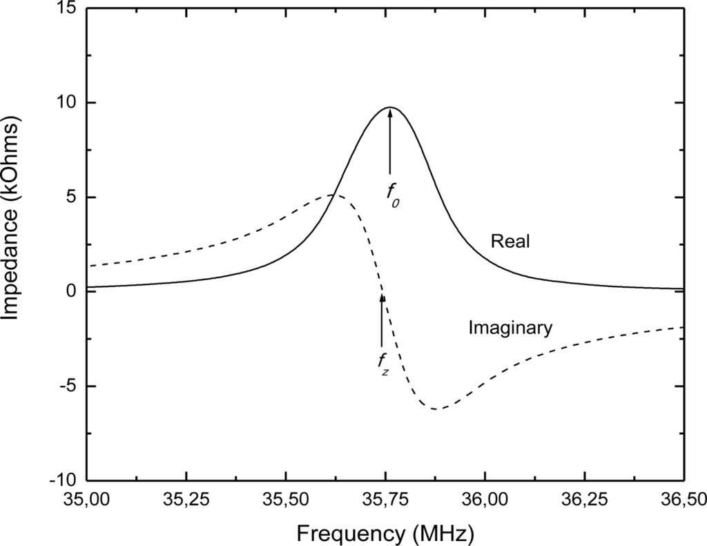 The sensor’s resonant frequency has been determined by measuring the impedance of the detection coil (placed around the sensor) with an impedance analyzer. Figure 3 shows the typical background-subtracted sensor’s impedance, where the resonant frequency f0 is defined as the frequency at the maximum of the real part of the impedance (resistance), and the zero-reactance frequency fz is the frequency where the imaginary part of the impedance (reactance) goes to zero. Referring to Figure 1(b), the resonant frequency and zero-reactance frequency are related to the R, L and C values as given by: