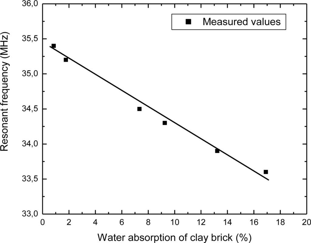 Furthermore, the described technique can be used for monitoring changes in the moisture state of building materials or relative moisture content and it is useful for many applications, for example monitoring the drying out of a building after a flood. However, some applications may also require the absolute measurement of moisture content. The presented method can be applied for this measurement, too. The calibration function between the resonant frequency and water content has been provided using stored material characteristic curves in a commercial Testo 606-2 instrument [20]. This instrument measures the material moisture of wood and building materials quickly and non-destructively and it is equipped with characteristics curves for most often used building materials such as cement screed, aerated concrete, solid brick, vertical hole brick, etc.