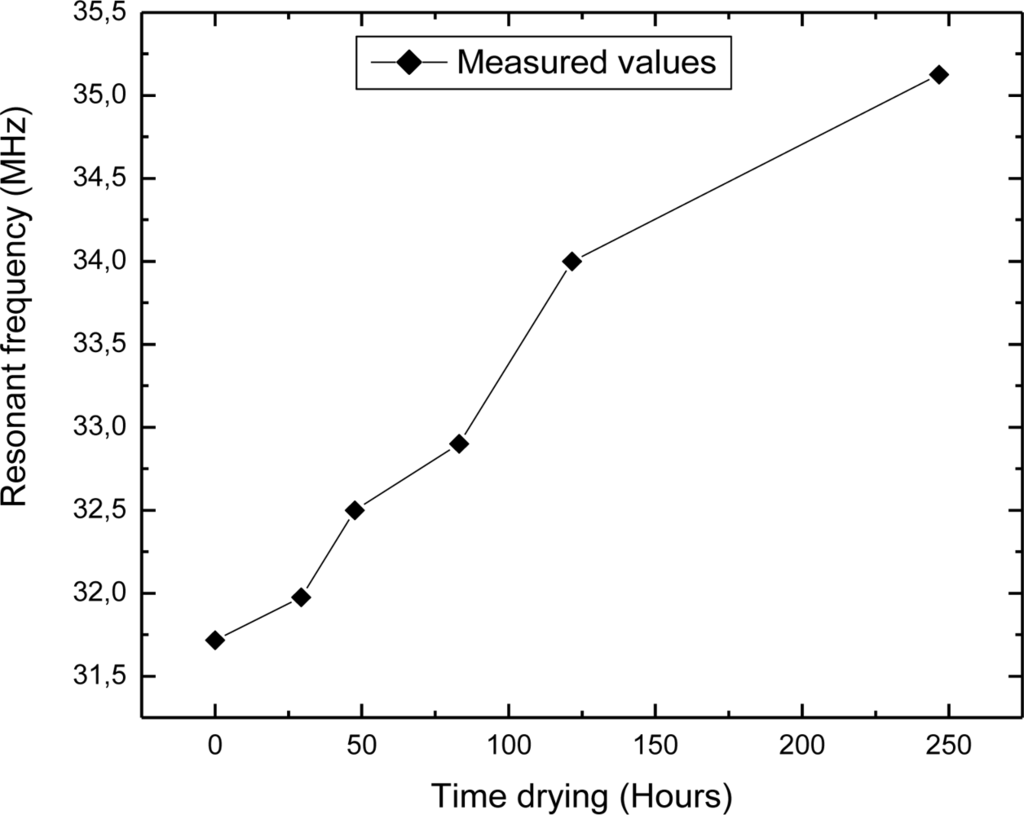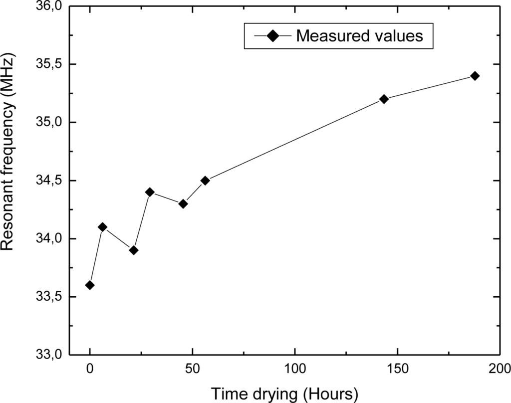 Using the experimental setup shown in Figure 4, the change in the sensor’s resonant frequency was measured as a function of time. In this section, measured results will be presented. Figure 5 depicts the dependence of the resonant frequency as a function of the percentage of water content in building bricks. From these data can be observed that the resonant frequency is changed from 35.4 MHz to 33.6 MHz, while the percentage of water absorption in the clay brick is increased from 1% to 17%. The variation of the resonant frequency was 1.8 MHz (≈ 5%), and water concentration was changed by 16%. Deviation of the measured values from the ideal linear dependence is very small (maximum error is 0.29%). Figure 6 represents dependence of the resonant frequency as a function of drying time. The time required for complete drying clay bricks at room temperature was about 190 hours. The resonant frequency of the sensor increased overtime, indicating the drying cycle of the brick. Presence of moisture increases the overall dielectric constant between the electrodes of interdigital capacitor, and vice versa. During the drying of the brick water started to evaporate, both dielectric constant and capacitance was decreased, and consequently the resonant frequency increased as can be seen in Figure 6.