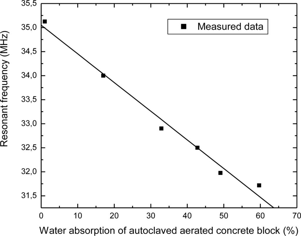 Autoclaved aerated concrete block has almost three times greater water absorption capacity than clay brick due to its more porous structure. The resonant frequency of the sensor in clay brick was lower than that in autoclaved aerated concrete block (just for illustration, for 15% of water absorption f0 = 33.72 MHz for clay brick, whereas f0 = 34.12 MHz for autoclaved aerated concrete block) since clay brick was denser and had a higher effective dielectric constant.