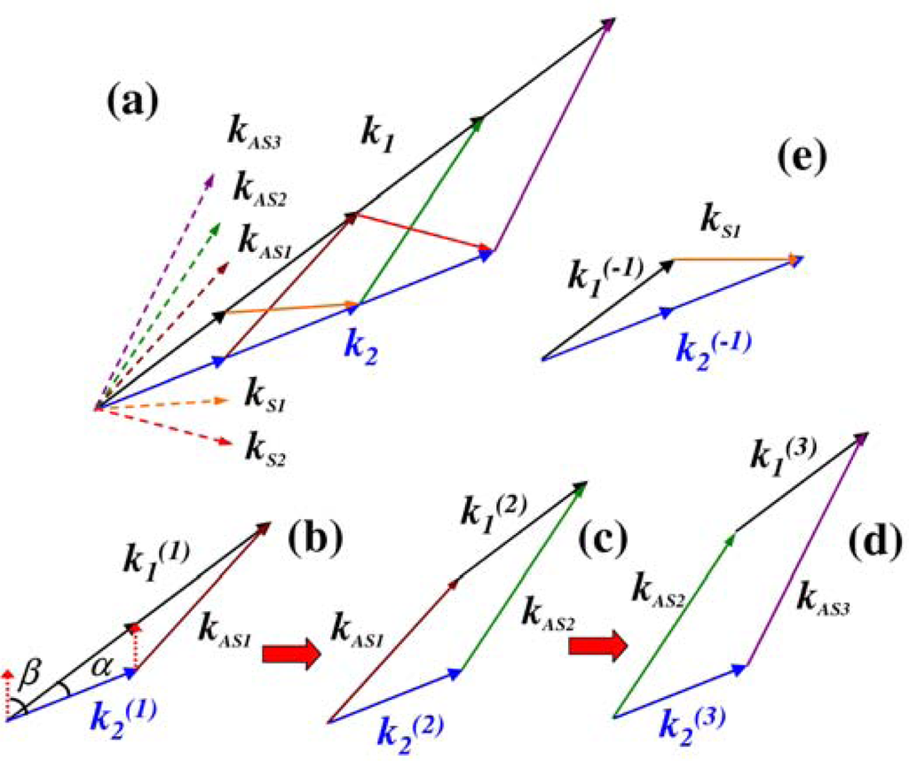 (a) Phase-matching geometry for CFWM process. Phase-matching geometries for generating (b) AS1, (c) AS2, (d) AS3, and (e) S1. k1 and k2 are the two input beams. The angle α is the crossing angle between the two input beams in the medium [33].