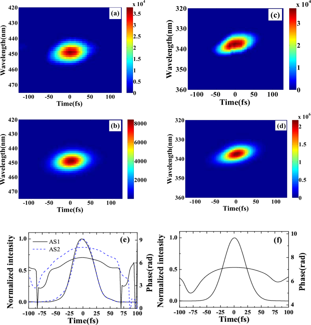 The pulse durations of S1, AS1, and AS2 were determined by cross-correlation measurement with beam4. Figures 10(a) and 10(b) show the measured and retrieved XFROG traces of S1 when the crossing angle was 1.87°. The corresponding XFROG traces of AS2 are shown in Figure 10(c) and 10(d). The recovered intensity profiles and phases of AS1 and AS2 are depicted in Figure 10(e) with retrieval errors of 0.012 and 0.010, respectively. The pulse durations of AS1 and AS2 were thereby found to be 45 ± 3 and 44 ± 3 fs, respectively. Figure 10(f) shows the recovered pulse profile and phase of S1 with a retrieval error of 0.005. The pulse duration was 46 ± 3 fs. All of the generated sidebands have almost similar pulse duration. The retrieved phase shows that there was some chirp in the pulses due to the small positive chirp of the input pulses and the dispersion of the glass.
