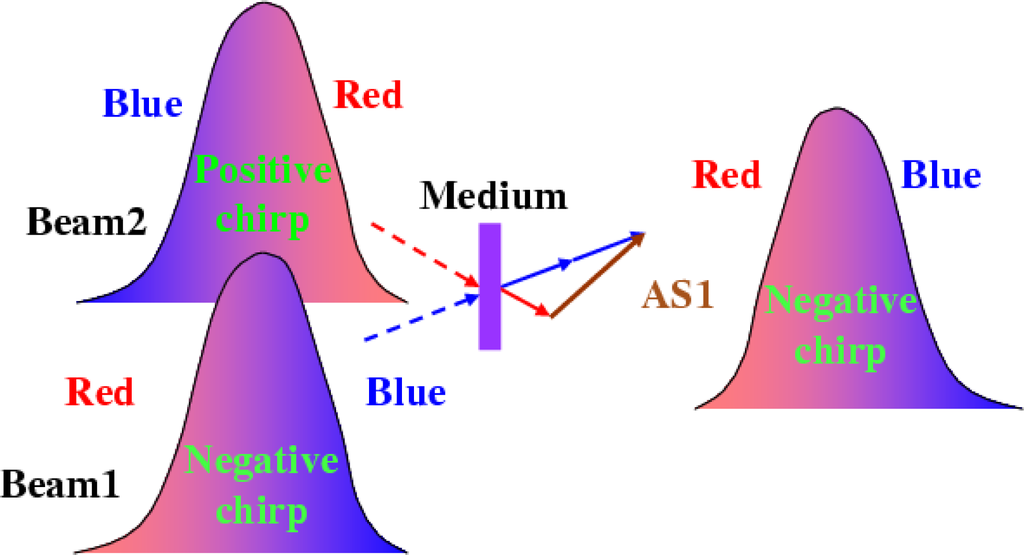 The principle behind the idea is simply explained in Figure 11. Beam1 is the input beam of shorter wavelength and is negatively chirped. Beam2 is another input beam having a longer wavelength and is positively chirped. As a result, when the two input beams are focused into a nonlinear medium to generate CFWM sidebands, the leading edges of the up-shifted anti-Stokes sidebands (AS1) will have shorter wavelengths, while the down-shifted Stokes sidebands (S1) will have longer wavelengths. Therefore, the anti-Stokes (Stokes) sidebands will be negatively (positively) chirped and the spectral bandwidth of the anti-Stokes sidebands will thereby be broadened.