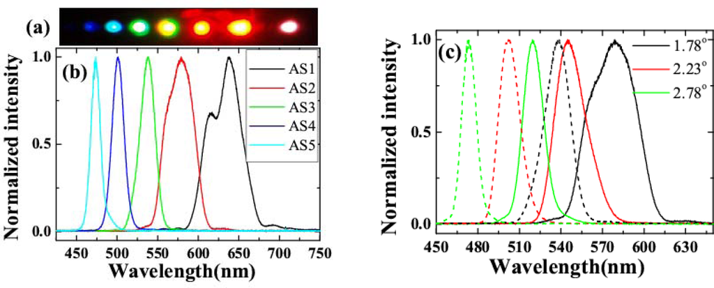 Multicolor sidebands appeared discretely in space next to the two input beams, as shown in Figure 12(a). The photograph was the sidebands viewed on a white sheet of paper placed about 30 cm after the glass plate when the input powers of beam1 and beam2 were 15 and 24 mW, respectively. Figure 12(b) plots the spectra of the CFWM sidebands from AS1 through AS5 when the crossing angle was 1.78°. As expected, the bandwidths of the sidebands were wider than those of the sidebands obtained when the two input beams were slightly positively chirped. The transform-limited pulse durations of the sidebands were 9, 12, 16, 16, and 16 fs from AS1 through AS5, respectively. These pulse durations were much shorter than the value of ∼25 fs obtained in above sections when the two input beams had only a small positive chirp. Figure 12(c) shows the spectra of AS2 and AS3 at 1.78°, 2.23°, and 2.78° crossing angles. The spectra of AS2 and AS3 are both simultaneously tunable by changing the crossing angle. The tuning spectral range increased with increasing the order number from AS1 to AS5. The spectrum of AS3 at 1.78° is located between the spectra of AS2 when the crossing angles are 2.23° and 2.78°, indicating that the spectra of the sidebands are continuously tunable.