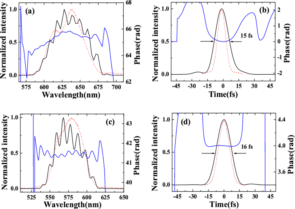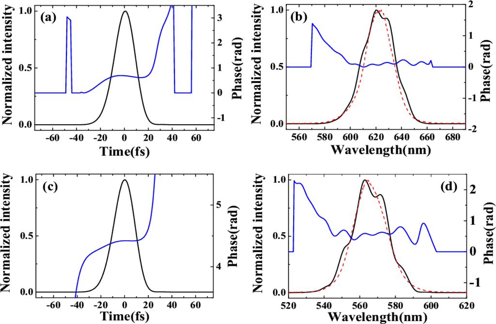 (a) Recovered spectrum (black solid curve), spectral phase (blue solid curve), and measured spectrum (red dotted curve) of AS1. (b) Recovered intensity profile and phase of AS1. The red dotted curve is the transform-limited (TL) (9 fs) pulse profile of AS1. (c) Recovered spectrum (black solid curve), spectral phase (blue solid curve), and measured spectrum (red dotted curve) of AS2. (d) Recovered pulse profile and phase of AS2. The red dotted curve is the TL (12 fs) pulse profile of AS1 [32].
