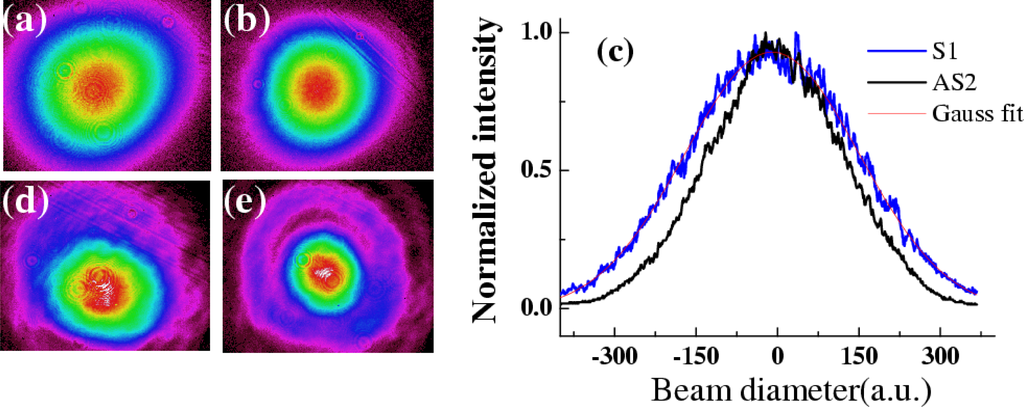 Following the experiment of Section 3.3, Figures 15(a) and 15(b) plot the two-dimensional spatial mode structure of S1 and AS3, respectively. Figure 15(c) shows the one-dimension spatial profiles of S1 and AS3. A Gaussian fit curve to S1 is also shown in Figure 15(c) and matches it well. The spot size of AS1 was first collimated using a concave mirror and then focused using a lens having a 700-mm focal length. The data of the diameter of the focal spot showed less than 1.1 times the diffraction limit. Weak diffraction-like rings around AS1 and AS2 were observed on a white screen. Interestingly, beam2 was focused and its spatial mode changed from elliptic to circular in cross section during the process, accompanied by diffraction-like rings. Figures 15(d) and 15(e) show the two-dimensional spatial mode of beam2 when beam1 was blocked and when the input power of beam1 was 20 mW, respectively. The resulting spatial mode improvement may be due to the generation of multicolor solitons [55,56].