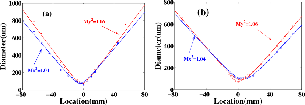 Measured beam diameters and M2 in both X and Y directions for (a) AS1 and (b) AS2 sideband, respectively [33].