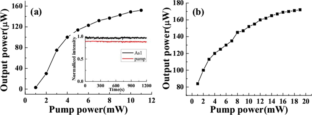 The dependence of the output power of AS1 on the power of one of the two input beams (a) dependence of beam1 power with the fixed power of beam2 of 19 mW; (b) dependence of beam2 power with the fixed power of beam1 of 11 mW. The inset in Figure (a) shows the power stability of AS1 and beam1 for twenty minutes [30].