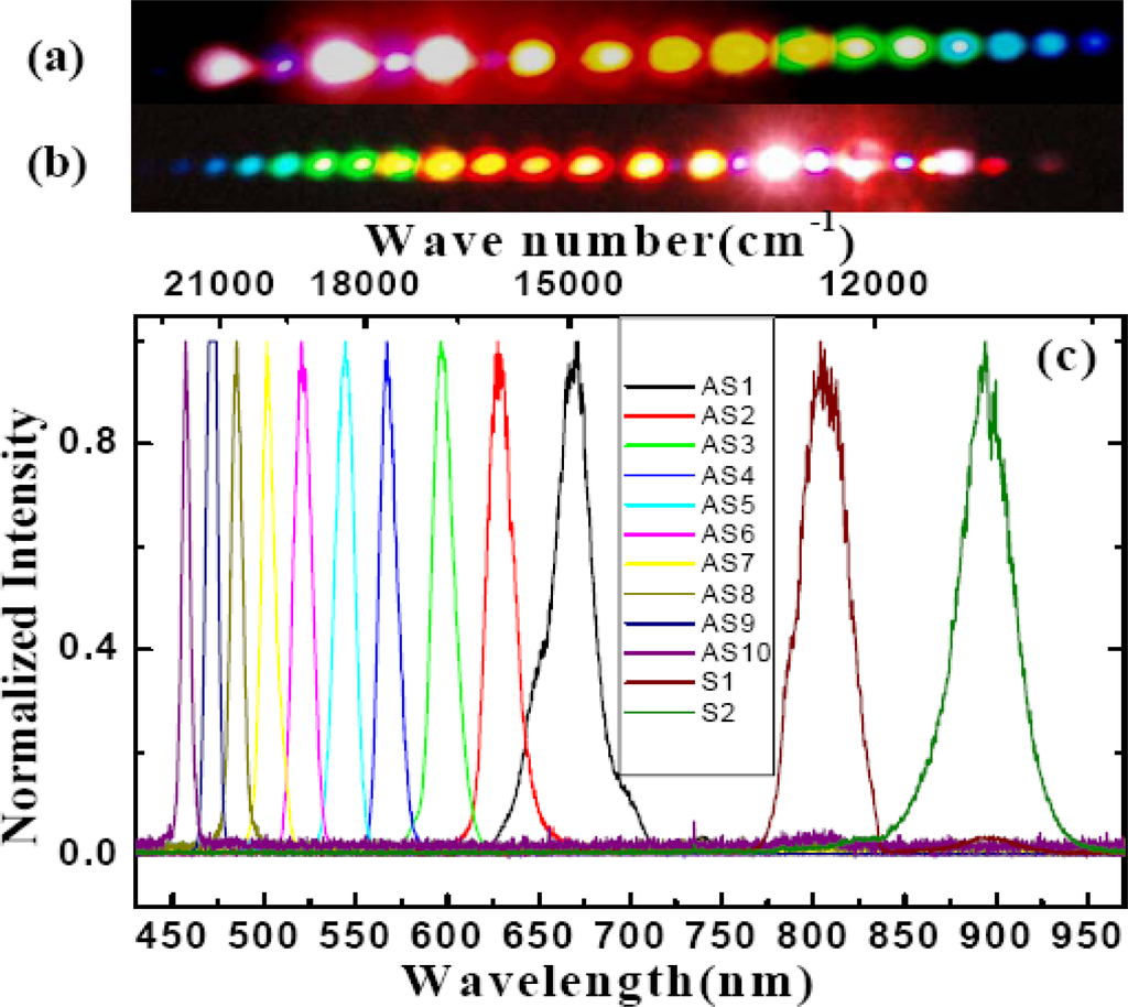 Photograph of the sidebands in a white sheet of paper behind the BBO crystal when (a) beam1 works as a pump. (b) beam2 works as a pump. (c) Spectra of sidebands from Figure (a), ASm(m = 1 – 10) refers to the mth-order anti-Stokes spectrum, Sn(n = 1, 2) refers to the mth-order Stokes spectrum [46].