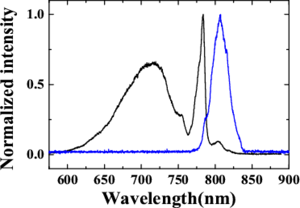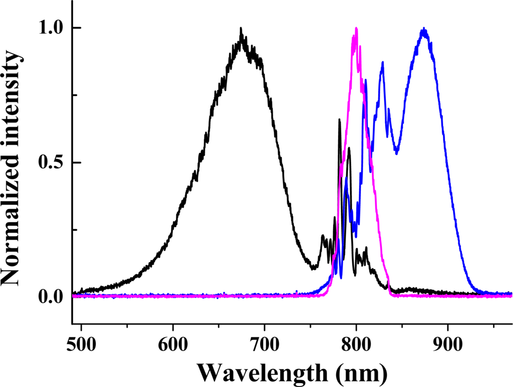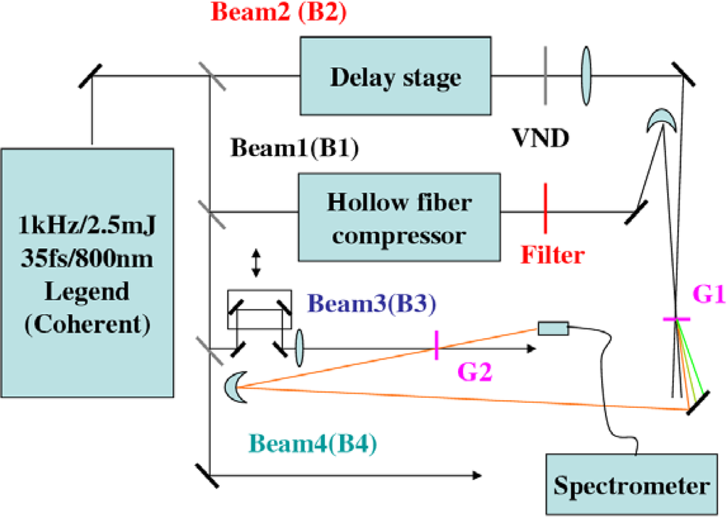 In the experiment, a 1-mm-thick fused silica plate was used as the nonlinear medium (G1) to generate CFWM sidebands. The cross-correlation width of beam2 with beam4 was about 82 fs. The cross-correlation width of beam1 with beam4 was extended to about 165 fs with positive chirp. The diameters of the two input beams on the surface of the fused silica glass were measured to be 180 μm. A SPF with cut-off wavelength at 800 nm was used as the filter for beam1. The spectra of beam2 and beam1 in front of the fused silica glass plate are shown in Figure 3.