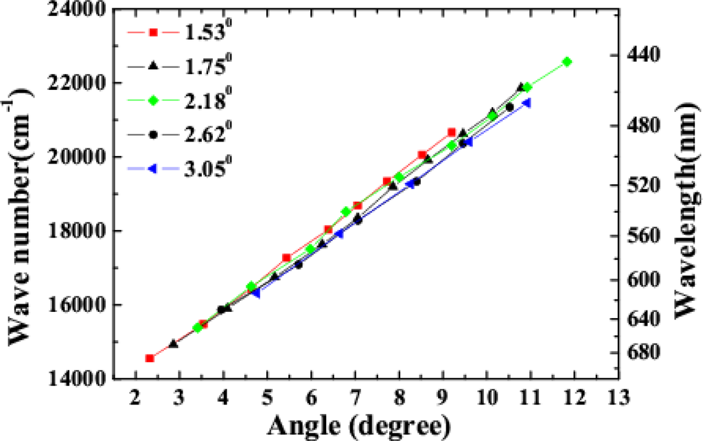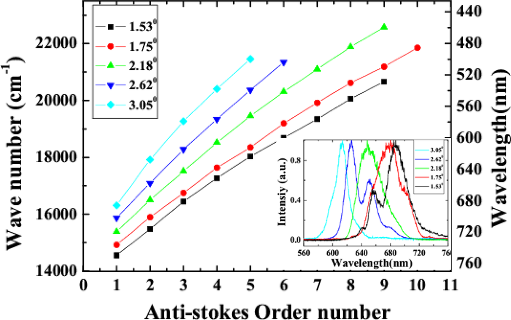 Variability of spectra of the sidebands on the crossing angle was studied. In the experiment, two beams were set at five different crossing angles in the air, 1.53°, 1.75°, 2.18°, 2.62° and 3.05°. We found that the spectra of the sidebands and the conversion efficiency were changed by varying the crossing angle, as shown in Figure 20 and its inset. Brightest sidebands signals were observed when the crossing angle was 1.75°. As the crossing angle was decreased, the sidebands became close to each other both in frequency and space. Weak continuous line was generated when the crossing angle was reduced to smaller than 1.0°. The frequency space between the two different sidebands was increased gradually with the increase of the crossing angle between the two input beams. For example, the frequency space between AS1 and AS2 was increased from 924 cm−1 to almost 1,608 cm−1 when the crossing angle was increased from 1.53° to 3.05°, as shown in Figure 20. The spectrum of AS1 was shifted to high frequency with the increasing of the crossing angle. We could see that the center wavelength of the sidebands can be tuned in a large bandwidth by changing the crossing angle. As the sidebands order was increased, the frequency separateness between the neighboring sidebands was gradually decreased. The frequency space between AS1 and AS2 is about 1,117 cm−1, which is gradually decreasing to 691 cm−1 for AS8 and AS9.