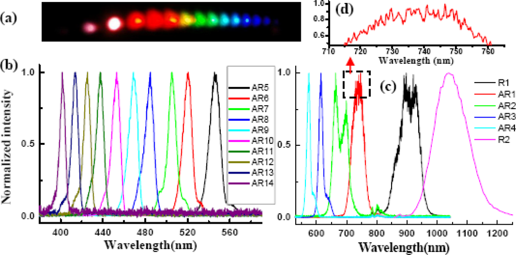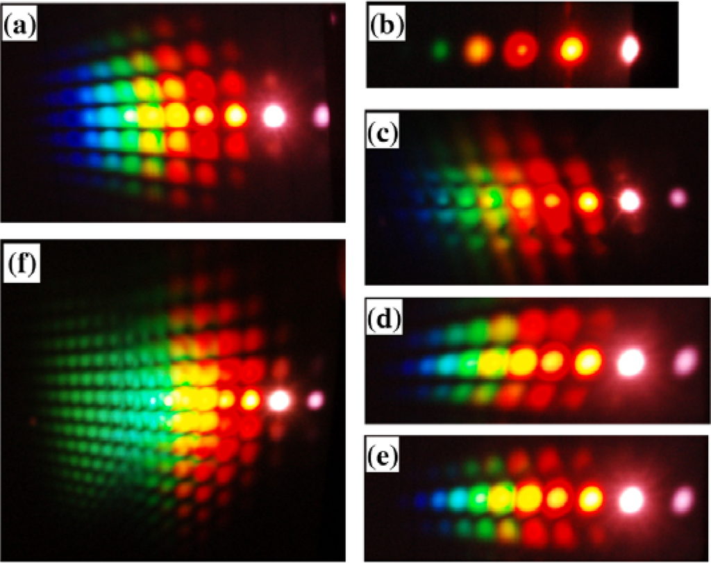 - Liu, J.; Kobayashi, T.; Wang, Z.G. Generation of broadband two-dimensional multicolored arrays in a sapphire plate. Opt. Express 2009, 17, 9226–9234. [Google Scholar]