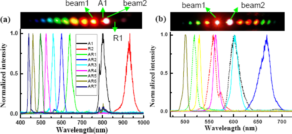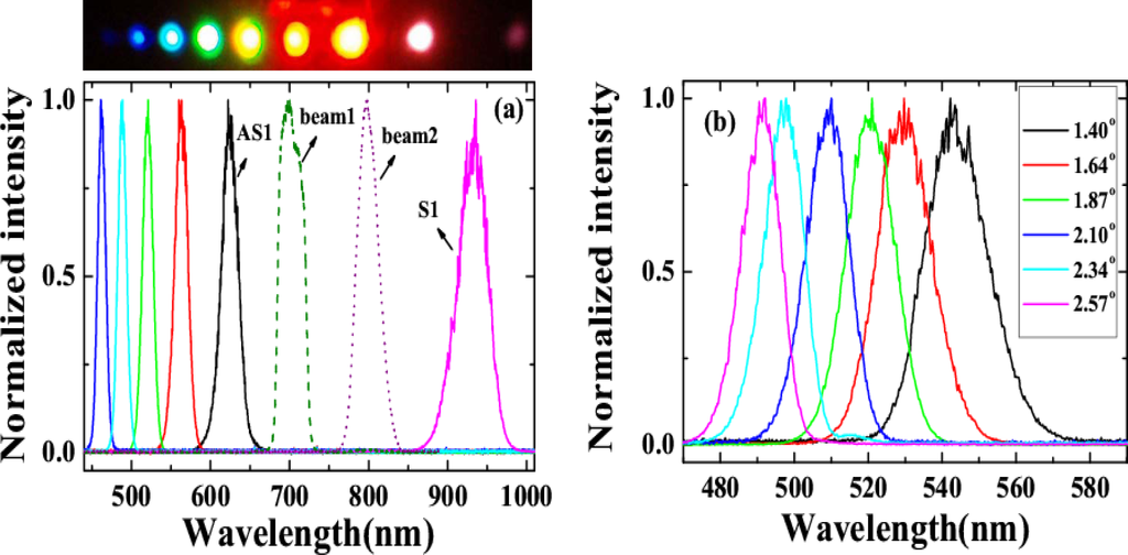 (a) The spectra of the sidebands from S1 through AS5 and of the two input beams when the crossing angle between the two input beams was 1.87°. (b) Spectra of AS3 at crossing angles of 1.40°, 1.64°, 1.87°, 2.10°, 2.34°, and 2.57°. The photograph at the top of Figure 8(a) shows the sidebands on a sheet of white paper placed 30 cm after the glass plate when the crossing angle between the two input beams was 1.87°. The first, second, and third spots from the right edge are S1, beam2, and beam1, respectively [31].
