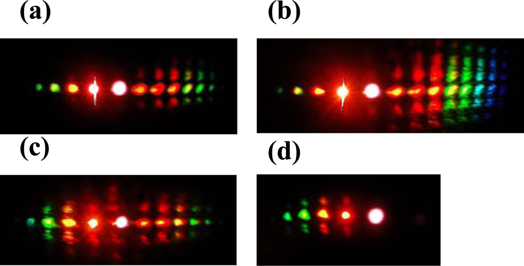 - Liu, J.; Kobayashi, T. Cascaded four-wave mixing and multicolored arrays generation in a sapphire plate by using two crossing beams of femtosecond laser. Opt. Express 2008, 16, 22119–22125. [Google Scholar]
