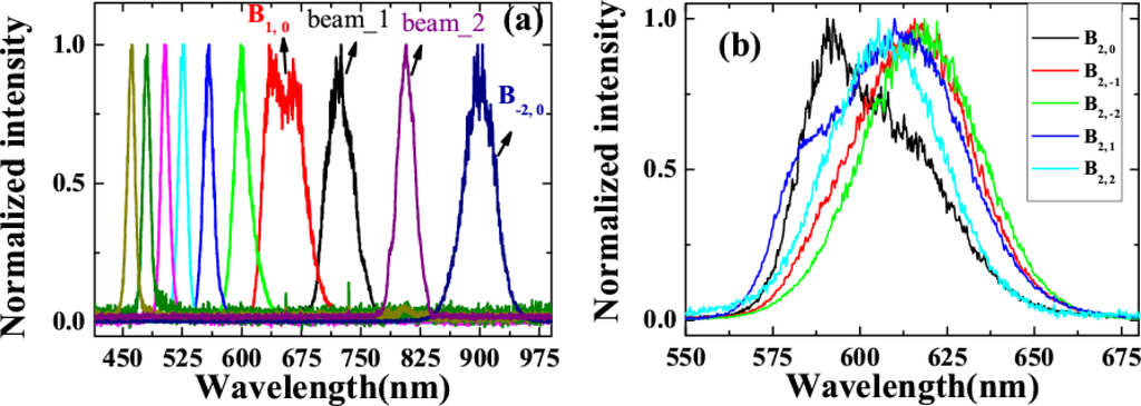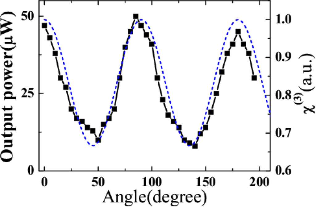 Figure 1 shows that the required length of wave vector |k(m)| for the generation of a FWM signal increases on both the anti-Stokes and Stokes sides when the order number increases. For anti-Stokes beams, the wavelength is blue-shifted as the order number increases, which accords with the need of increasing length of |k(m)|. In this case, phase matching can be achieved up to higher-order sidebands. However, the wavelengths of the Stokes beams increase with an increase of the order number. This red-shifted wavelength does not satisfy the requirement of increasing length of |k(−m)|. As a result, the phase mismatch for the Stokes signal increases rapidly with the order number. Consequently, there are fewer Stokes sidebands than anti-Stokes sidebands generated in the output signal. The calculation described below gives the same result. We also can see that the maximum exit angle in the medium will be limited by the angle β (see Figure 1(b)) on the anti-Stokes side due to the phase-matching condition. Based on the trigonometric formula, β can be expressed as: