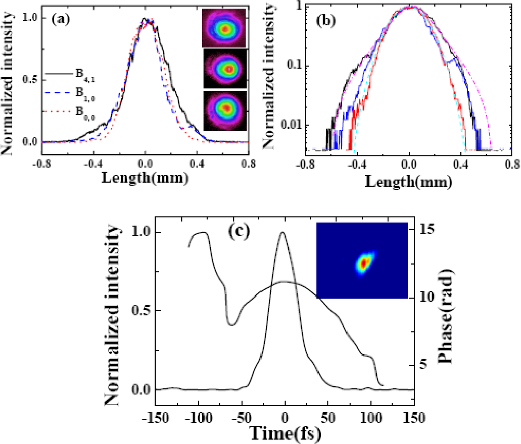 Here, the input laser parameters were the same as Section 3.2.2. The pulse durations of AS1 and AS2 were measured by XFROG. The spectral and temporal profile and the phase were retrieved with a 256 × 256 grid. The retrieval error was smaller than 0.010. Figures 14(a) and 14(c) show the temporal profiles and phases of AS1 and AS2. The pulse durations of AS1 and AS2 are 20 and 22 fs, respectively, which are very close to the transform limited pulse durations of AS1 and AS2 (18 and 19 fs, respectively). The nonlinear phase changes due to crossing phase modulation and self-phase modulation, etc. in the medium combine with the dispersion of the 1-mm-thick glass compensate the chirps of the generated sidebands. The obtained pulse durations were even shorter than the transform-limited pulse durations of the two input beams, which are 32 fs and 33 fs for beam1 and beam2, respectively. Figures 14(b) and 14(d) show the retrieved spectra and the spectral phases of AS1 and AS2, respectively. The retrieved spectra reproduced the measured spectra very well. The retrieved phase shows a small positive chirp and some high-order dispersion. No dispersion compensation in the optical component for the output sideband was used in this process. In the process, the 1-mm-thick glass plate can only induce limited dispersion that can compress the pulse for about 1 fs in this wavelength. Then, the group velocity delay between two input pulses and the nonlinear phase in the process may affect the compression result. More detail analysis will be done through numerical simulation in the future.