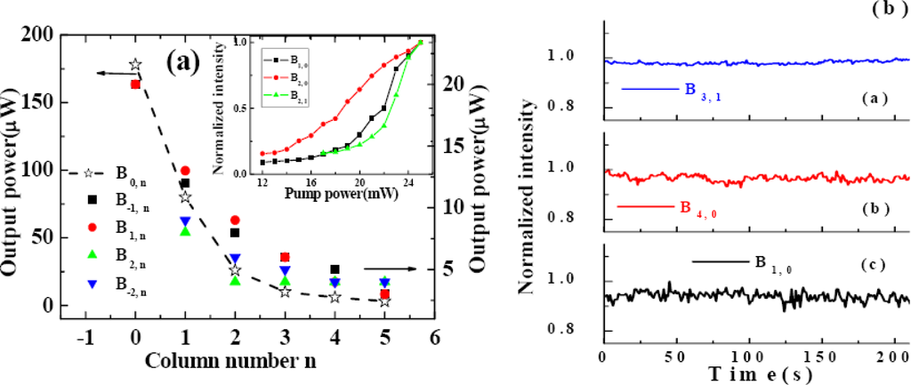 3.5. Spatial Profile and Power Stability of Multicolored Sidebands