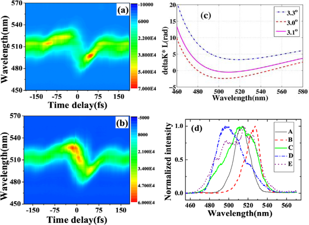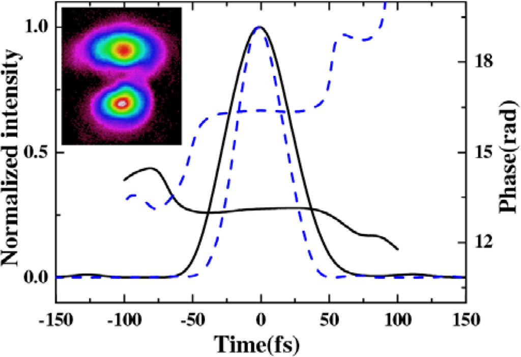 The pulse durations of AS1 and AS2 were measured by cross-correlation with beam4. We decrease the pulse duration of beam1 by changing the dispersion compensation. We found that the pulse duration of AS1 was even shorter than that of the two incident pulses, when the cross-correlation width of beam1 and beam4 was about 84 fs. Figure 5(b) shows the retrieved XFROG pulse trace and phase of the AS1 with a retrieved error of 0.017. The retrieved pulse duration was about 35 fs. The retrieved phase shows that there is some positive chirp in the pulse due to the positive chirped input pulses and the dispersion of the glass.