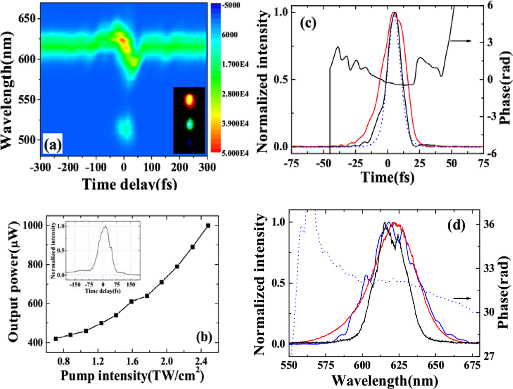A quasi-linear chirp can be imposed across the weak seed pulse when the pump pulse is much wider compared with it [65]. In the same way as SPM-based compressors, the phase induced by XPM can also be compensated by using a chirped mirror pair. Furthermore, XPM based compressor can have more flexibility than SPM ones because the phase can be tuned by the pump pulse. After four bounces on a pair of chirped mirrors (−40 fs2/bounce), the pulse duration of the weak output pulse was measured by XFROG. The spectral and temporal profiles and the phase were retrieved with a 512 × 512 grid. The retrieval error was smaller than 0.006. The retrieved temporal profiles of both the incident seed pulse and the compressed output seed pulse, and the transform-limited pulse for the broadened seed pulse are presented in Figure 34(c). The 22.6 ± 0.5fs incident pulse was compressed to 12.6 ± 0.5 fs, which is well close to the calculated transform-limited pulse duration of 10.5 fs. The retrieved spectrum and spectral phase of the output seed pulse are shown in Figure 34(d).
