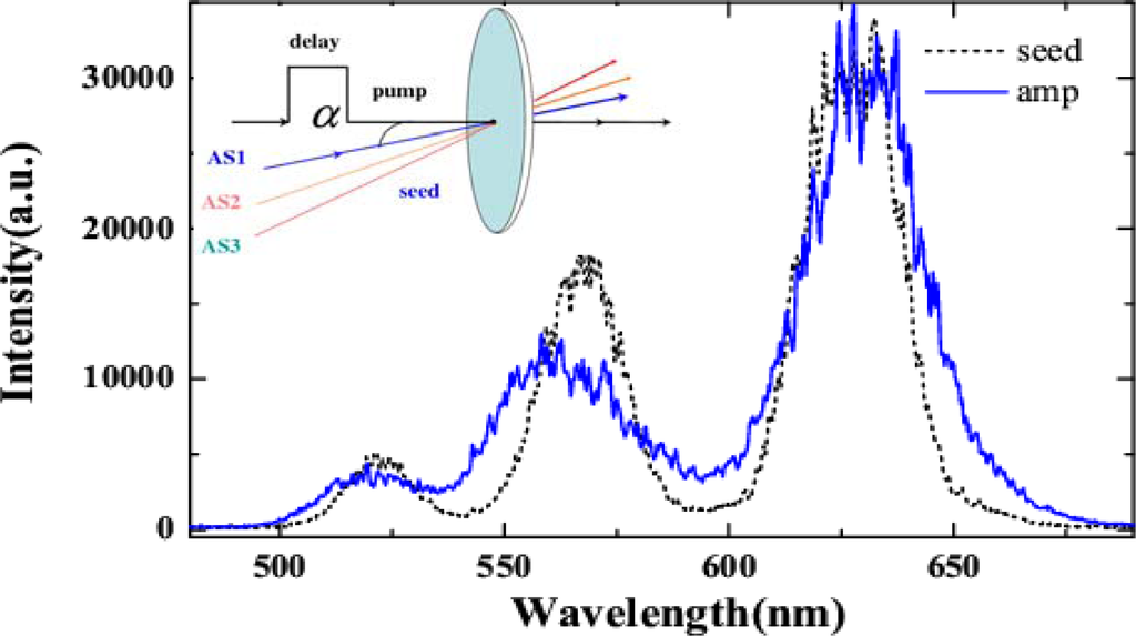 We also guided three beams, AS1, AS2, and AS3 generated by CFWM into the glass at the same time. The schematic of the experimental setup was shown in the inset of Figure 35. The beam diameters of AS1, AS2, and AS3 on the 0.5-mm thick fused silica glass were all about 190 μm. The crossing angles between pump beam and three anti-Stokes sidebands, AS1, AS2, and AS3 were about 2.6°, 2.9°, and 3.2°, respectively. The pump pulse energy was 160 μJ with about 350μm diameter on the glass. When these seed and pump beams synchronized in time on the glass, the spectra of the three seed beams, AS1, AS2, and AS3 were broadened simultaneously, as shown in Figure 35. The pulse energy of AS1, AS2, and AS3 were also amplified from 133, 40, and 12 nJ to 163, 50, and 15 nJ, respectively. This experiment shows that it is possible to simultaneously amplifying and compressing several weak pulses in a bulk medium at the same time. Then, it can be used for cascaded FWM process to optimize the spectrum of the obtained sidebands which was expected to obtain single cycle pulse after combine the optimized sidebands [28].
