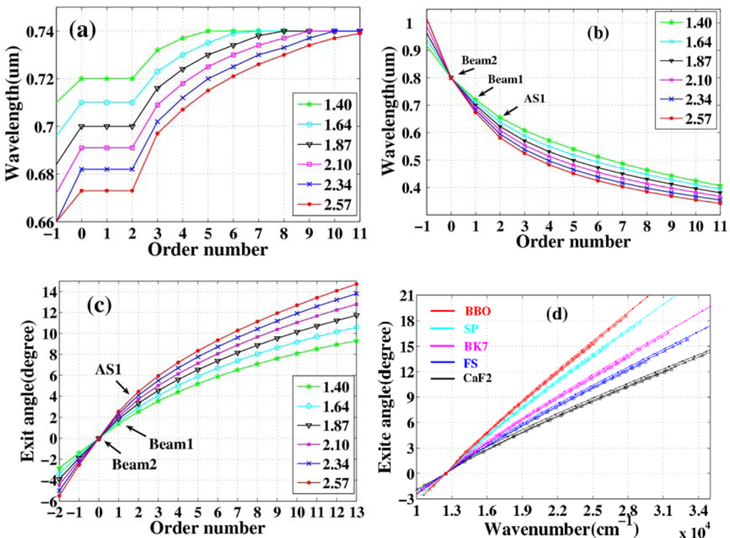 It can be explained in the same way when the external crossing angles are 2.10° and 2.57°. It explains that it is difficult to obtain higher order Stokes sideband. Figure 36(b) shows the evolution of the wavelength of the generated sidebands with the order number at several different external crossing angles (1.40°, 1.64°, 1.87°, 2.10°, 2.34°, and 2.57°). It clearly shows that the wavelength of the same order sideband can be tuned by changing the external crossing angle. Figure 36(c) shows the exit angles of different sidebands at several different external crossing angles, the evolution agrees well with the experiment data given in Figure 8(a) in section 3.3. Figure 36(d) shows the curve of the dependence of the exit angle of the generated sidebands on the center wavelength of generated sidebands for several different media. It is interesting to see that the curves are almost overlapped for different external crossing angles for the same medium. Here, in Figure 36(d), we only display the curves at 1.40°, 1.87°, and 2.57° three different angles. The slope of wavenumber to exit angle are about 830, 916, 1,136, 1,315, and 1,602 cm−1/degree for BBO crystal, sapphire plate, BK7, fused silica, and CaF2, respectively. As for BBO crystal, this result is in accordance with Figure 20 in Section 3.6.1.