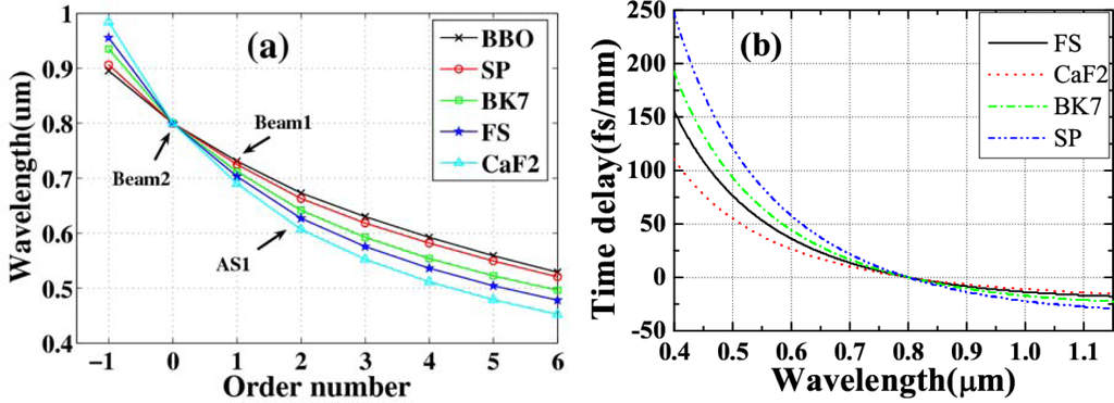 (a) Dependence of the wavelength of generated sidebands on the order number in five different media (CaF2, fused silica, BK7, sapphire plate, and BBO crystal) when the crossing angle is 1.8°. (b) The group delay between beam2 (800 nm) and other wavelength in CaF2, fused silica, BK7, and sapphire plate with 1mm thickness [33].