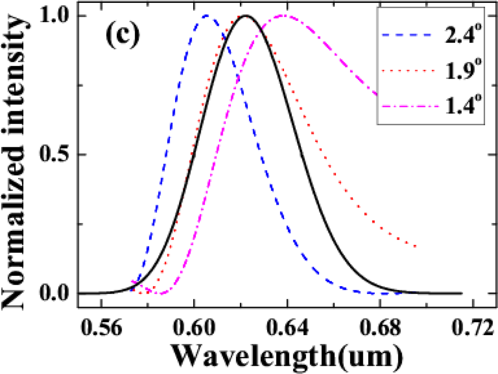 In the calculation, the input parameters are the same as above calculation. The ideal AS1 signal intensity was shown in Figure 38 with black solid line. The curves related to phase mismatching sin c2 (Δkz (Ω, ω1, ω2)L/2) at 1.4°, 1.9°, and 2.4° were shown in Figure 38 with dash-dot line, dotted line, and short dash line, respectively. The same as above calculation, the phase mismatching was calculated through fixed one wavelength of beam1 and scan the wavelength of beam2 in several spectral bandwidth region in a 0.2-mm fused silica glass. It shows obviously the dependence of the spectrum of AS1 on the crossing angle of the two input beams. We can see that the output wavelength not only dependent on the phase mismatching but also the ideal curve (or the spectra of input pulses). In same way as described in references [54,66],