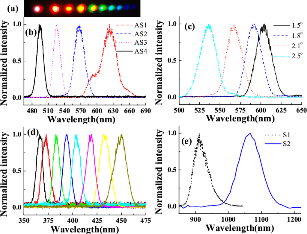 Multicolored CFWM signals appeared individually in space beside the two input beams as beam1 and beam2 were synchronously on the fused silica glass in both time and space. The photograph at the top of Figure 8(a) shows CFWM sideband signals on a white sheet of paper placed about 30 cm after the glass plate. The input powers of beam1 and beam2 were 9 and 20 mW, respectively. Figure 8(a) shows the spectra of the sideband wavelengths from S1 to AS5 CFWM signals along with the spectra of two input beams when the crossing angle between them was 1.87°. The spectrum extends from 450 to 1,000 nm. All the sidebands have nice Gaussian spectral profiles. According to Figure 8(b), the peak wavelength of AS3 can be tuned from 490 to 545 nm by changing the crossing angles from 1.40° to 2.57°. Compared with results in Section 3.2.1, this tuning range is narrower, due to the narrower spectral bandwidth of beam2.