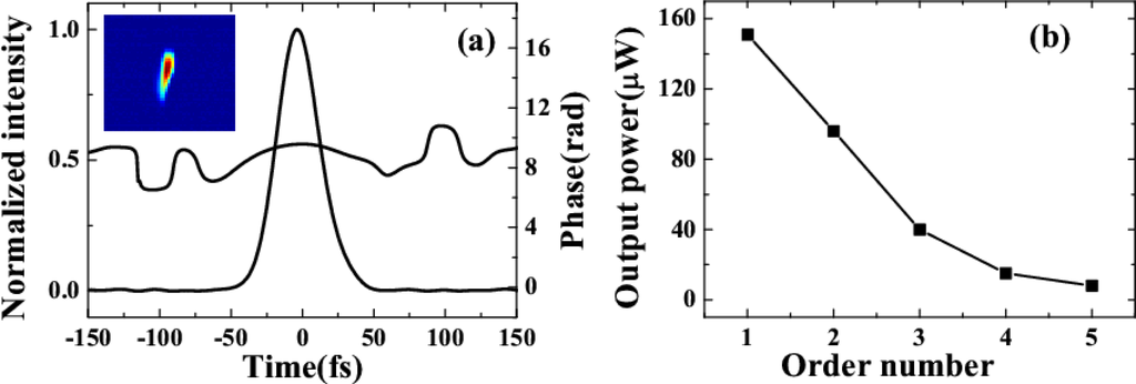 (a) The XFROG retrieved trace of the temporal profile and phase of AS1. The pulse duration is about 35 fs. The inset is the measured XFROG pattern; (b) the output power of AS1 to AS5 when the input power of beam1 and beam2 were 11 and 19 mW, respectively, and the crossing angle was 1.8° [30].