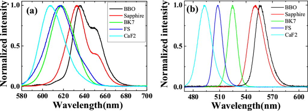 From the theory analysis in the second section, the wavelength of the generated sideband is decided by the phase-matching condition. As a result, it can also be tuned by changing the refractive index of the bulk medium. In the experiment, we change the refractive index of the medium by simply replacing the medium with different materials. The spectral filter used in the optical layout was a BFP centered at 700 nm with 40 nm bandwidth. The pulse duration of beam2 was 75 fs with positive chirp, while that of beam1 was 50 fs with negative chirp. The input power of beam1 (beam2) was 8 (24) mW and its diameter on the surface of the transparent bulk medium was 250 μm (300 μm) in the vertical direction and 300 μm (550 μm) in the horizontal direction.