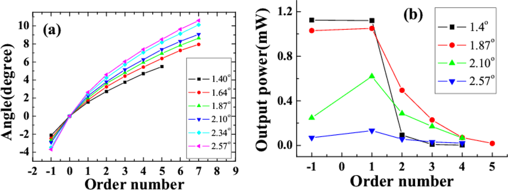 (a) Dependence of the angles between the generated sidebands and beam2 ( with 0 order number) on the order number of the sidebands when the crossing angle between the two input beams was 1.40°, 1.64°, 1.87°, 2.10°, 2.34°, and 2.57°. (b) Dependence of the output power on the order number when the crossing angle between the two input beams was 1.40°, 1.87°, 2.10°, or 2.57°. Order number-1 refers to S1, 1 refers to AS1, and so on [31].