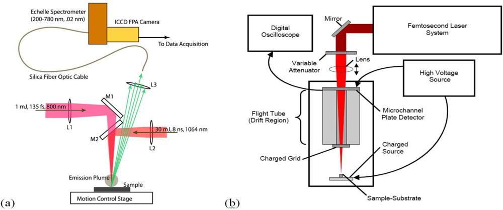 A LIBS system schematic is shown in Figure 1 that illustrates excitation with either nanosecond or femtosecond laser pulses. Most femtosecond LIBS studies to date have been performed using Ti:Sapphire based laser systems. Readily available commercial systems can produce pulses with durations in the 30–150 fs range with energies of 1–100 mJ at repetition rates up to 1 kHz. The wavelengths for excitation are restricted primarily to those that can be developed with sufficient energy to produce emission. Typically, studies have been performed with wavelengths around 800 nm or at wavelengths corresponding to frequency doubled or tripled radiation. In laboratory studies, laser outputs are focused with lenses to produce the fluences/fluxes required for plasma formation. The optical emission from the plasma is collected using standard reflective or refractive optics and is analyzed and recorded using spectrometers optimized for transient optical signals. For results shown here, an Echelle-type spectrometer was used (200–785 nm, resolution of 0.02 nm) with a computer interfaced intensified charge-coupled device (ICCD) camera. The image intensifier in the camera was controlled using gating electronics and a digital delay generator internal to the camera head provided gating of the recorded spectrum with an adjustable delay and width. LIBS events and emission spectrum collection were synchronized using delay generator electronics. To assist with the interpretation of LIBS spectra, it is often useful to measure other ablation plume characteristics especially when the interaction is poorly understood. In our work, we have measured ionized products using a time-of-flight mass spectrometer since this permits identification of molecular species produced when organic materials are excited. A schematic of a single femtosecond pulse, ablation-ionization, mass spectrometer system is also shown in Figure 1.