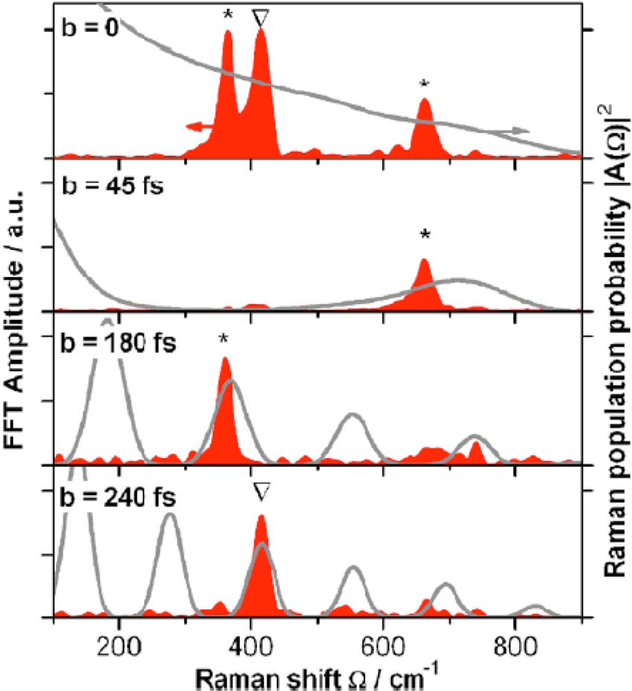 fs CARS spectra from [57]. Control results for molecular vibrations selectively excited in a binary mixture of CHCl3 and CBrCl3 with time-resolved single beam CARS. A suitable multipulse spacing b achieves full selectivity and control over all the accessible modes of CHBr3 (marked “Δ”) and CHCl3 (marked “*”). Reprinted from von Vacano et al. [57]. Copyright 2007, American Institute of Physics.