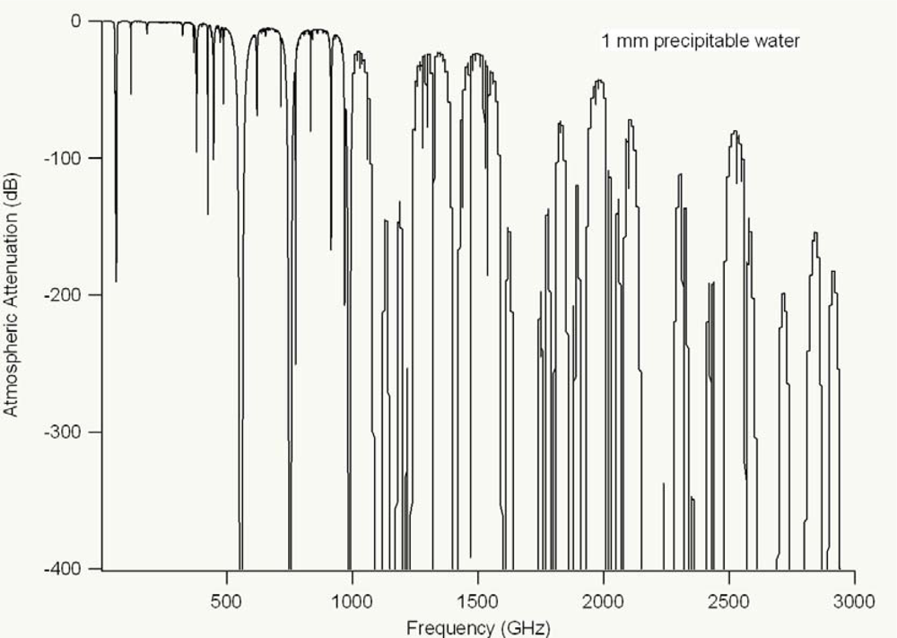 Atmospheric attenuation (in dB) of 1 mm precipitable water from 10 GHz to 3 THz. (Model calculations based on [102] www.smm.caltech.edu/cso/weather/atplot.shtml).