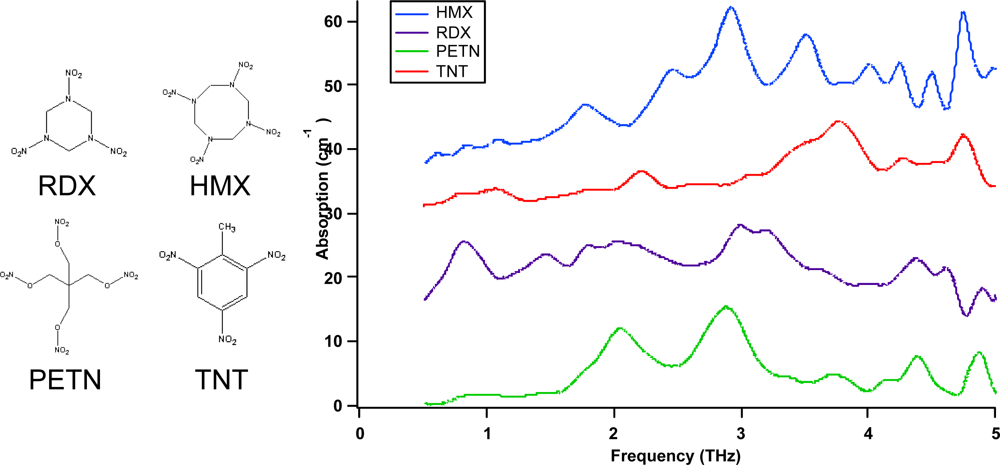 [Left] Chemical structure of the explosives RDX (1,3,5-trinitroperhydro-1,3, 5-triazine), HMX (1,3,5,7-tetranitroperhydro-1,3,5,7-tetrazocine), PETN (pentaerythritol tetranitrate), and TNT (2,4,6-trinitrotoluene). [Right] THz time-domain spectra of four explosives in polyethylene powder pellets. Data adapted from [85].